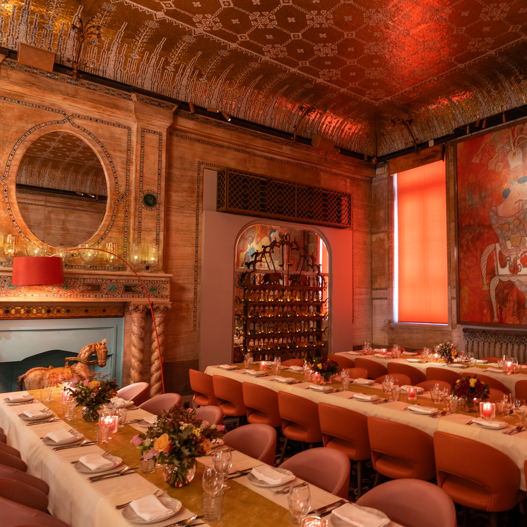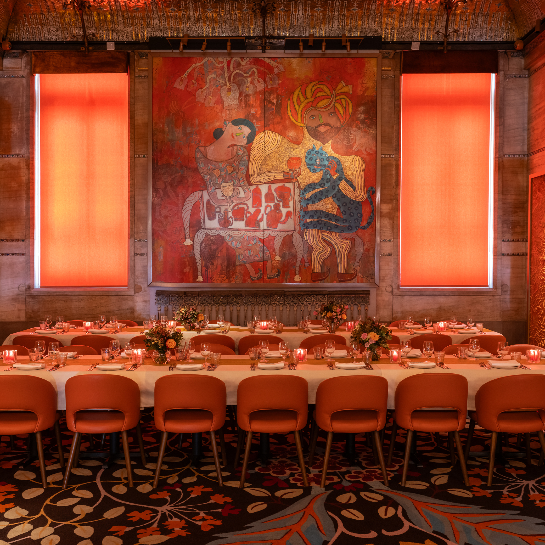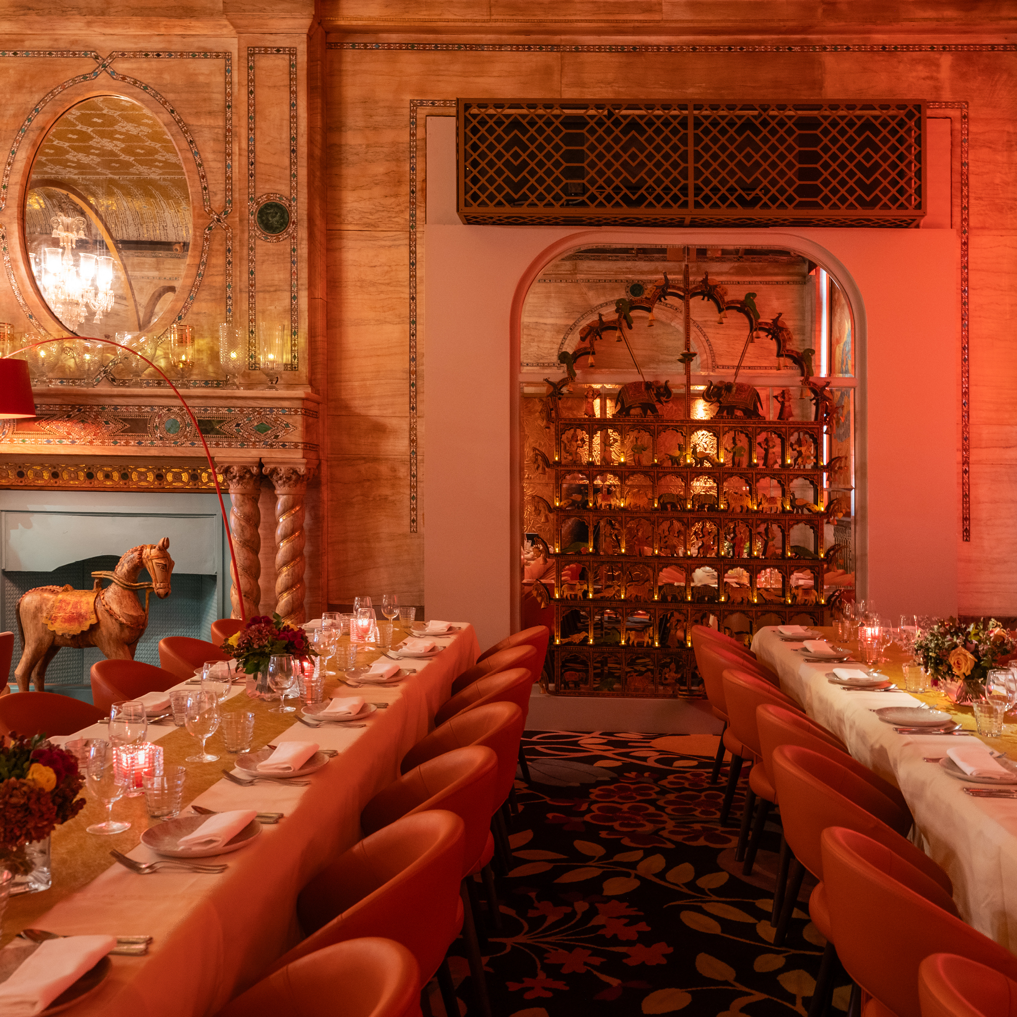 The captivating interiors ooze rich sophistication, blending modern design with striking displays of Indian lamps, artefacts & paintings against orange & red wall panels.