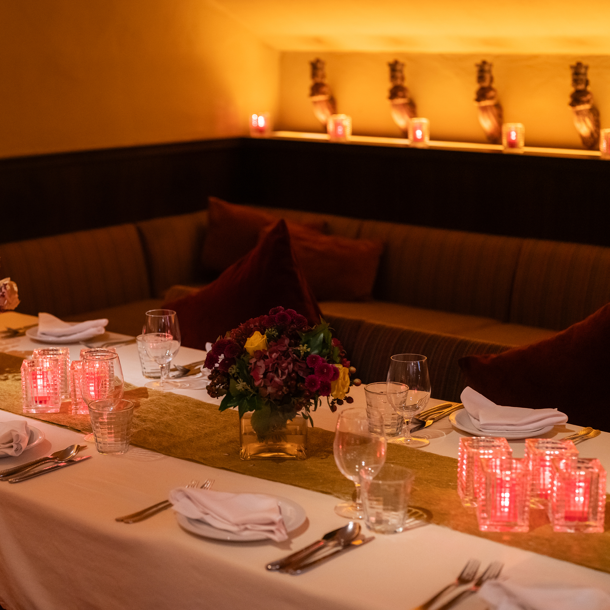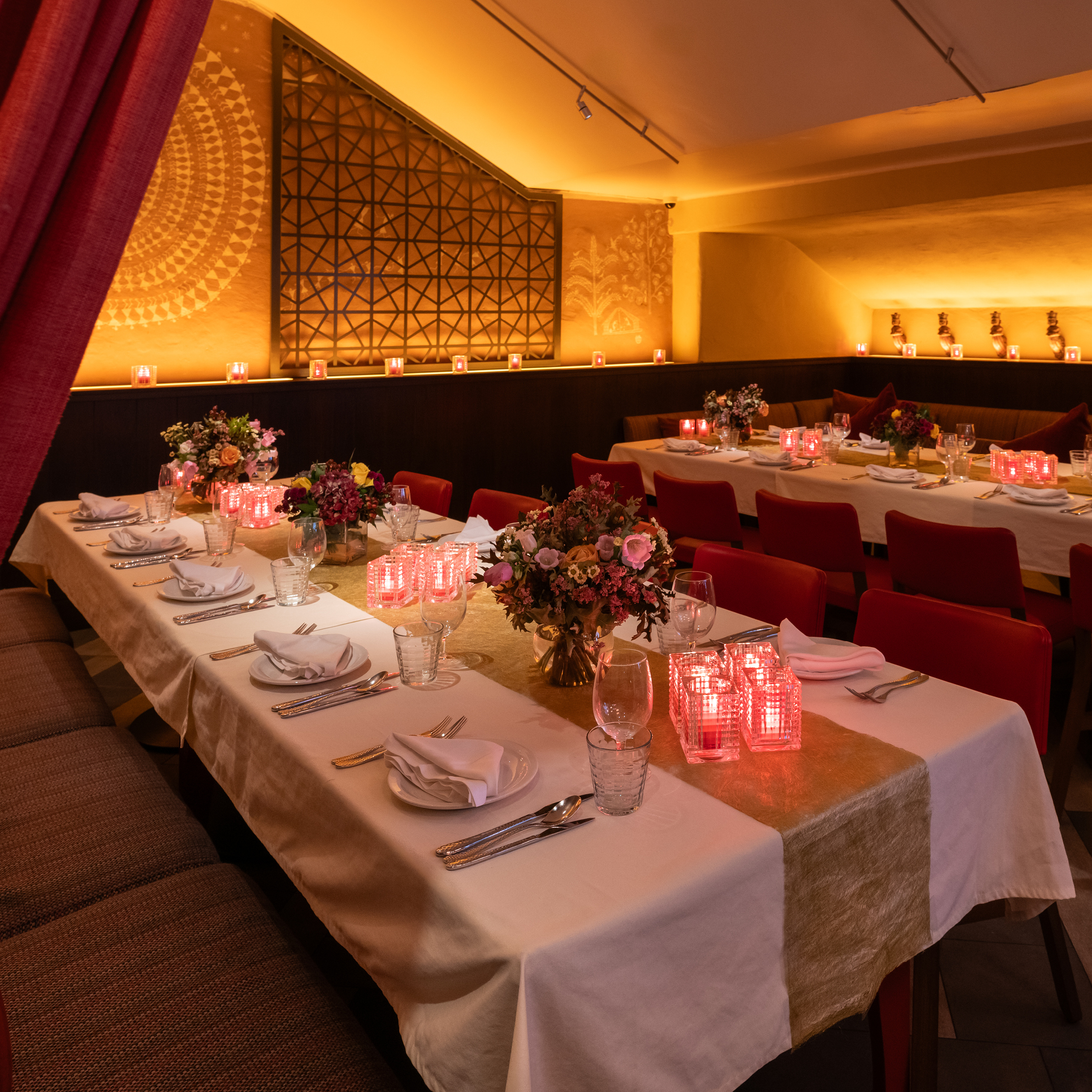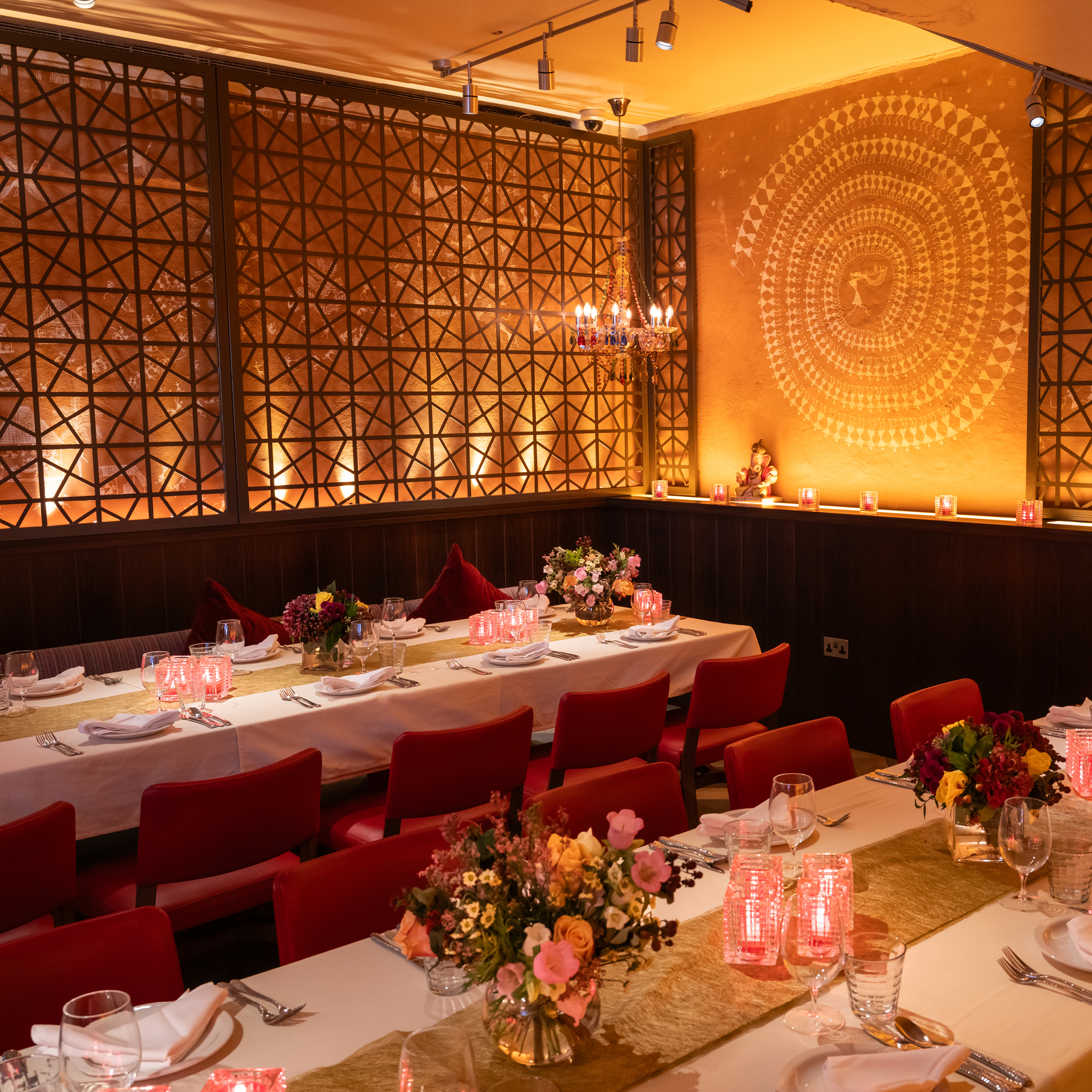 Curtained-off party area seats 24. Exclusive use for 15+ subject to hire charge; Dinner party menus £32.50 - £50.50; lunch £29.25-£45
